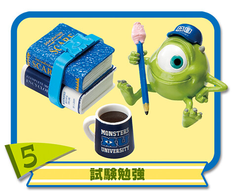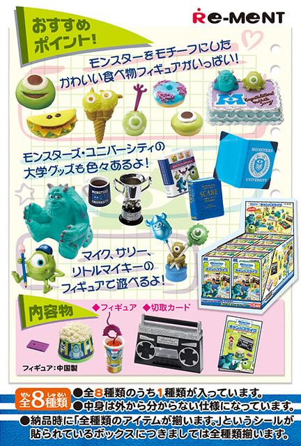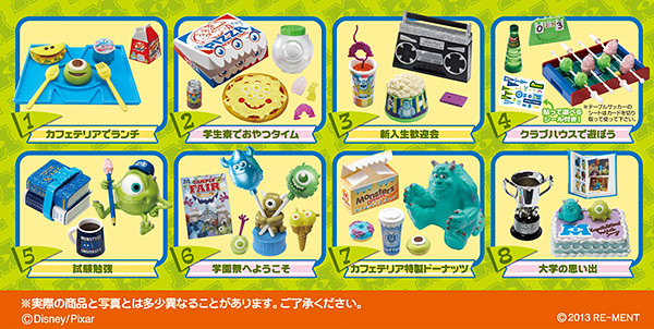 預定6月28日上映的怪獸大學(MONSTERS UNIVERSITY)是皮克斯的著名動畫怪獸電力公司的前傳。這次電影將帶大家回顧這一對好兄弟在大學時代不打不相識的歡樂回憶。日本玩具公司RE-MENT特別為此設計一系列盒玩,收錄各種趣味十足的「怪獸風格」場景道具盒玩。每盒日幣售價525圓(稅入),預計2013年7月1日推出,提供大家參考!