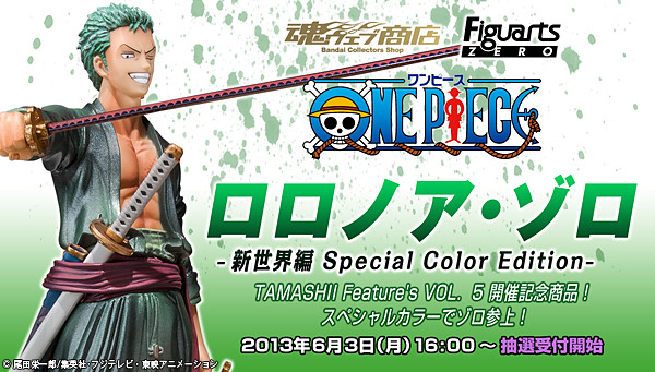 今年3月於台灣舉辦的魂フィーチャーズ VOL.5(TAMASHII Feature's VOL.5) 所販售限定品「Figuarts ZERO 羅羅亞‧索隆 新世界編 Special Color Edition」(フィギュアーツZERO ロロノア・ゾロ),以新世界的造型為設計,使用了金屬、珍珠光色澤來上色的特殊款式,現在將於日本魂商店限定抽選販售。