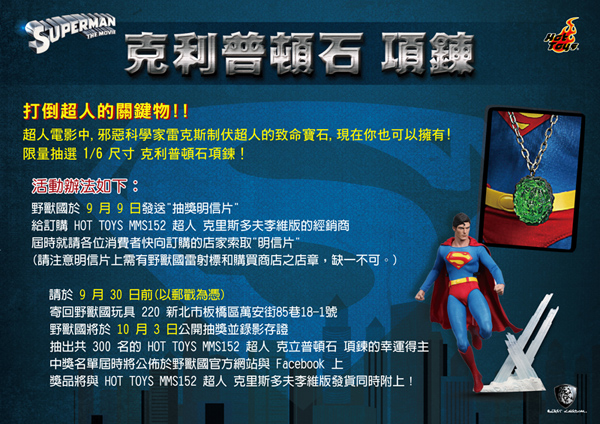 情報 12吋 Hot Toys 野獸國 Hot Toys 超人 克力普頓石項鍊抽獎辦法! 熊倒 2011-09-02 17:09:41 分享 ✕ 分享 已複製網址 分享到 Facebook 分享到 LINE 分享到 Reddit 分享到 Twitter 分享到 Plurk 分享到微博 野獸國公布了 Hot Toys 超人 克力普頓石項鍊的抽獎辦法,有預定的玩家快去參加吧!~ 熊倒 玩具熱愛者與情色蒙面藝術家的Rockin'Jelly Bean的信徒。對12吋、吊卡玩具以及復古造型有莫名的狂熱。