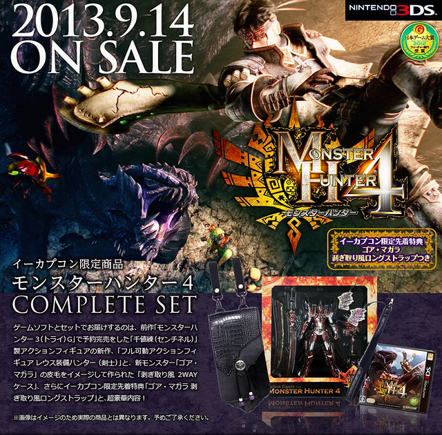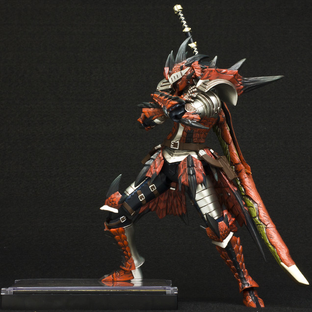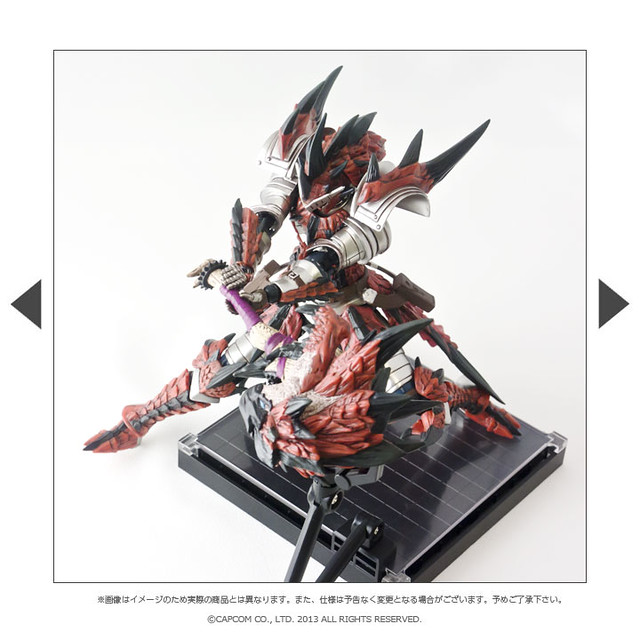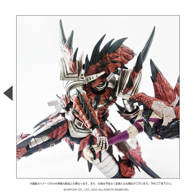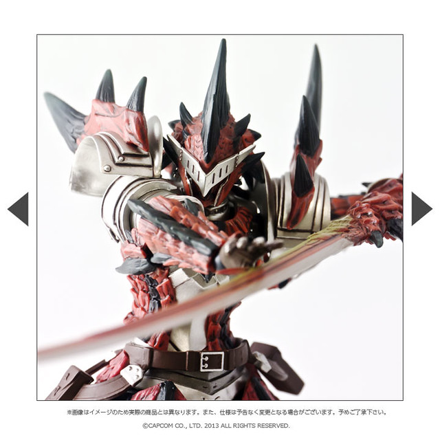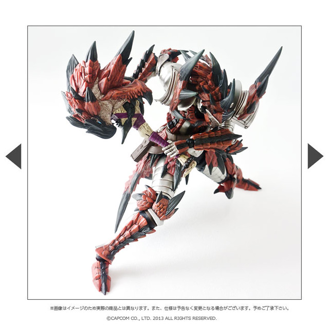 即將在3DS 平台上登場的「魔物獵人4」(モンスターハンター4),將推出一系列的同捆商品,其中最受矚目的就是由千值鍊所製作的「雄火龍裝男剣士」,除了搭配左右3種替換用的手部零件,另外還有雄火龍武器太刀“飛竜刀”與刀鞘一組、重錘“飛竜砕フラカン”、專用的台座以及台座主題紙(三種),豐富的內容、精緻高完成度的外型搭配高可動性,可重現出許多「魔物獵人」所出現的經典動作與畫面。