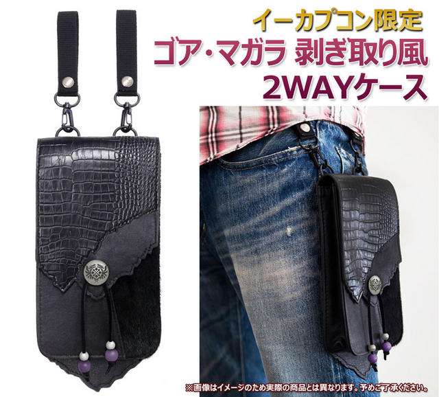 另有剝皮風格的兩用包(ゴア・マガラ 剥ぎ取り風2WAYケース),使用了「鱗」「皮」「毛」...各種異種素材為意像作為設計,並加上了「接受任務」(クエスト受注)的符號,充滿了原作世界的氛圍。尺寸約20 × 11 × 4 公分,可收納錢包、手機...多功能用途。
