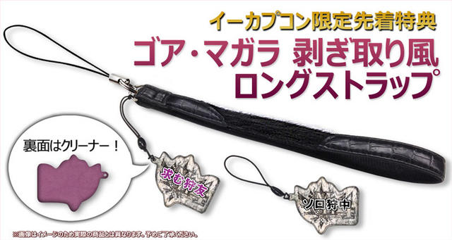 除此之外,也有剝皮風格的吊飾(ゴア・マガラ 剥ぎ取り風ロングストラップ),同樣使用剝皮風格的設計意像與素材,並貼心地採用了不會刮傷銀幕的金屬材質與拭鏡工具,搭配「求む狩友」(徵求狩友)「ソロ狩中」(單獨狩獵中)兩種訊息的吊飾,可以向街上的其它獵人表現自己的狀態。