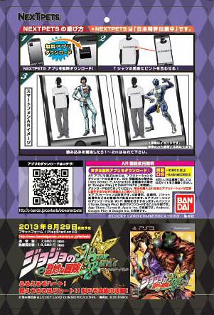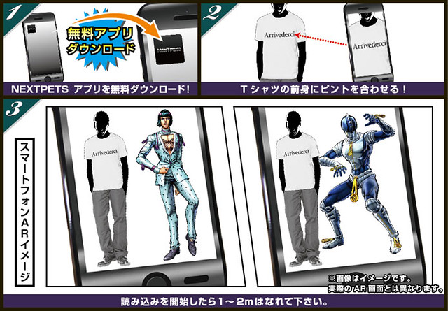 日本知名的玩具廠商「BANDAI」旗下、結合了擴增實境(Augmented Reality,簡稱AR)技術的「NEXTPETS」系列,將推出JOJO冒險野郎 替身能力T恤,第二彈是『布加拉提 & 鋼鍊手指』!