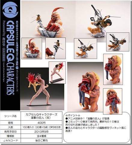 玩具新聞 日系 海洋堂 進擊的巨人 膠囊Q博物館 海洋堂 膠囊 Q CHARACTERS系列 進撃的巨人 奶油隊長 2013-06-07 12:56:49 分享 ✕ 分享 已複製網址 分享到 Facebook 分享到 LINE 分享到 Reddit 分享到 Twitter 分享到 Plurk 分享到微博 最近動畫進撃的巨人真的很夯,連日海洋堂玩具公司的CAPSULE Q 膠囊 Q的CHARACTERS系列轉蛋商品預計2013年9月推出進撃的巨人,首波預計推出四款種類有巨人吃人類、艾倫對決超大巨人、三笠在巨人手掌上和艾倫變成巨人後打爆巨人(真饒舌),將會推出完全上色版,最下面的照片等等為之前玩具展覽先行曝光的素色樣品,單轉約400元日幣,情報提供給喜歡進撃的巨人的玩具人做參考。 2013年6月7日新增官網清晰宣傳照片。 奶油隊長 沈迷收集玩具、嗜好設計玩具、熱愛視覺圖像的思考模式,同時也超愛吃各種口味的美式漢堡,希望可以一直玩玩家到 100 歲。