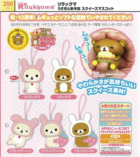 最新的這一款「與兔子一起玩耍~ 拉拉熊超軟Q吊飾」(暫譯,リラックマ うさぎとあそぼ スクイーズマスコット),使用了女孩子最喜歡的兩個主題「兔子」與「草莓」來製作造型,並使用了特殊的軟Q材質,捏起來QQ 的手勁絕對會令人上癮呀!~