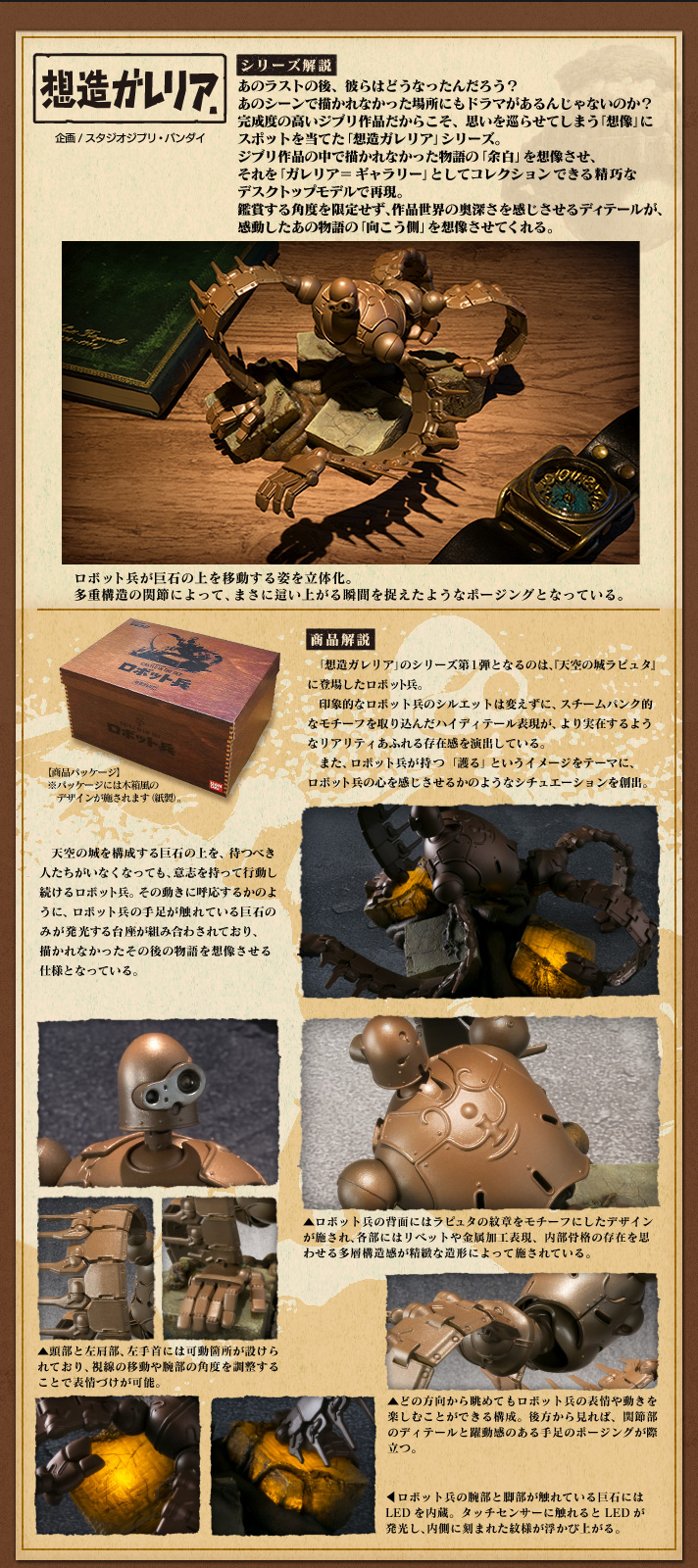 第一彈商品為「天空之城 機械兵」將其在巨石上移動的模樣立體化,忠實地呈現其多構造關節的動態。機械兵腳步碰觸到的巨石內建LED 發光功能,並且在巨石內部作了特殊設計,發光就會顯現其紋章。此外,木盒印刷圖樣(紙製)的包裝更添加了收藏質感,這絕對是一款讓我們重溫舊作的精彩作品~