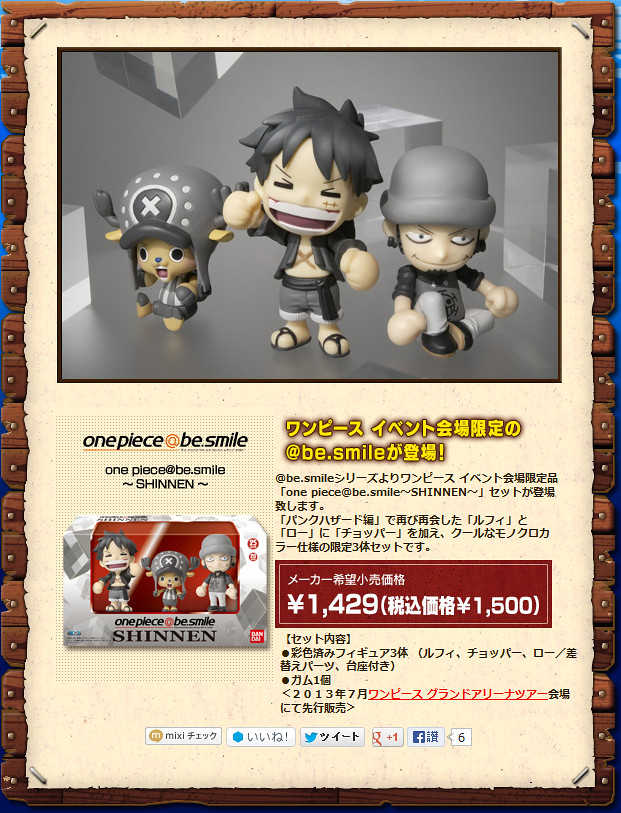 海賊王知名的療癒人心“微笑”系列「one [email protected]」,宣布將推出海賊王巡迴展“GRAND ARENA TOUR”限定版「one [email protected]~SHINNEN~」,集結了「龐克哈薩德篇」再會的「魯夫」、「羅」以及「喬巴」,使用特殊限定的黑白配色三隻套裝組合。