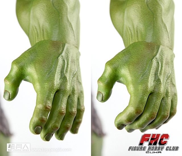 ▼ 採用包膠設計的可動式手掌,手指關節的小孔似乎是為了爭取可動性,令其容易彎曲,稍稍破壞了美感有點可惜。不過相信有收藏這一款浩克的玩具人也不太會有機會讓他擺出一個無聊得出布手勢吧?!