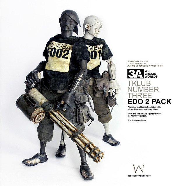 threeA 令人超級興奮的TK俱樂部第三彈終於發表了!~ 這次一共推出兩位角色EDO1、EDO2的套裝組合,一位TK 按照慣例手持雙刀,而另一位則是threeA 系列商品中首見的帶著俗稱Mini Gun 的M134迷你砲!除此之外還使用了新款式的頭雕、鉚釘造型手臂以及全新開發的手指可動手掌!~