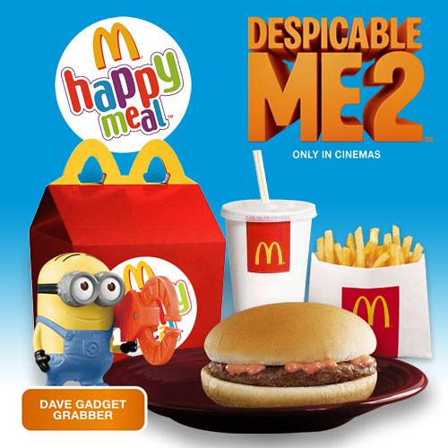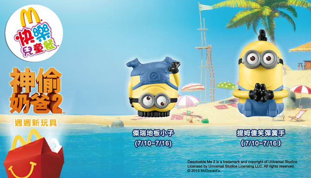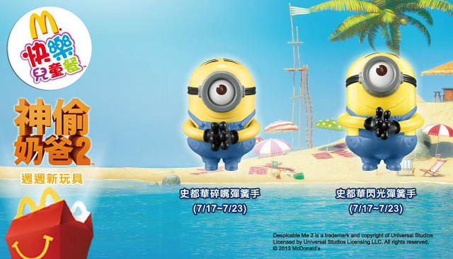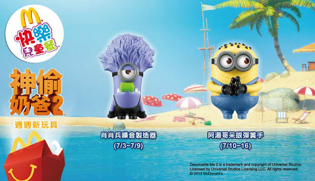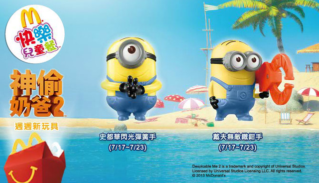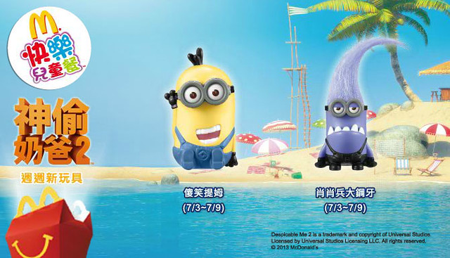 將於2013年7月在台灣上映的動畫電影Despicable Me 2 神偷奶爸2,片中相當受到歡迎的Minion 黃色小小兵 歡樂角色,現在麥當勞快樂兒童餐在今天7月3日將推出隨餐附贈玩具,共推出約有9款角色玩具,每款都有不同功能和專屬的名稱,喜歡神偷奶爸裡面出現的歡樂小小兵的玩具人,可以去吃一下快樂兒童餐順便獲得隨餐附贈的小小兵玩具。