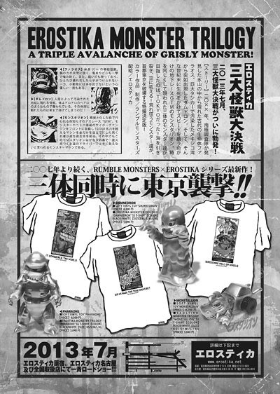 由RJB 所繪製的三款Erostika 週年紀念海報:「PHARAOHS」(一週年)、「DAMNEDRON」(二週年)與「MONSTALLION」(三週年),當年與復古軟膠玩具製作工作室「RUMBLE MONSTERS」合作推出,在多年後的今天,將以『怪獸三部曲』(MONSTER TRILOGY)的形式再度復活。將再度推出三款經典的軟膠怪獸以及其主題原畫海報圖樣的新設計T恤。這些紀念商品將於日本時間2013年7月6日中午12點Erostika 本店發行,日本時間2013年7月6日晚上8點於Erostika 網路商店販售。