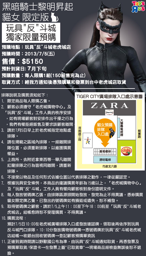 為了慶祝台中老虎城的「玩具“反”斗城」開幕,Hot Toys 台灣代理野獸國玩具,將在2013年7月5日當天,於台中老虎城「玩具“反”斗城」開放獨家限量預購的“Hot Toys 黑暗騎士:黎明升起『貓女-限定版』”