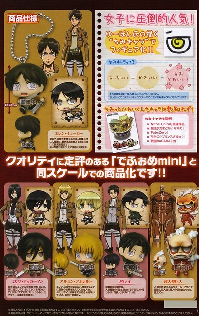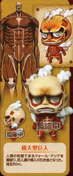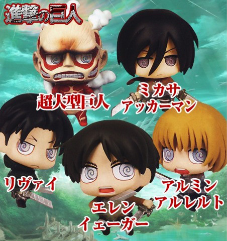 日Takara Tomy玩具公司也看中了近期十分火熱的人氣動畫進擊的巨人,預計將在2013年10月份推出進撃の巨人 ちみキャラマスコット,進擊的巨人 Q版造型轉蛋預計推出有主要角色艾倫、三笠等等,連超大巨人也變成Q 版造型,單轉約200元日幣,提供給喜歡動畫進撃的巨人的玩具人參考。
