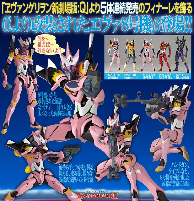 日海洋堂玩具公司的輪轉可動系列預計2013年10月15日發行リボルテックヤマグチ No.139 エヴァンゲリオン8号機β 正規実用型(ヴィレカスタム),編號139 的新世紀福音戰士EVA改8號機β 正規實用型(Wille Custom),和之前已販售的Revoltech No.134 EVA 8號機α胸前裝甲、手臂和腳部等等裝甲部分略有不同,可以參考下方五機體站在一起的照片。