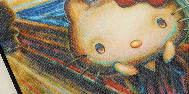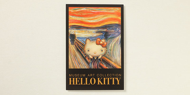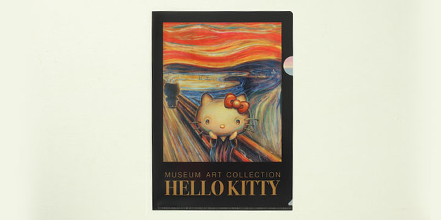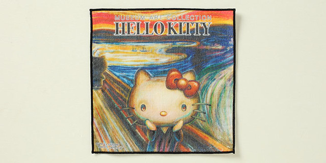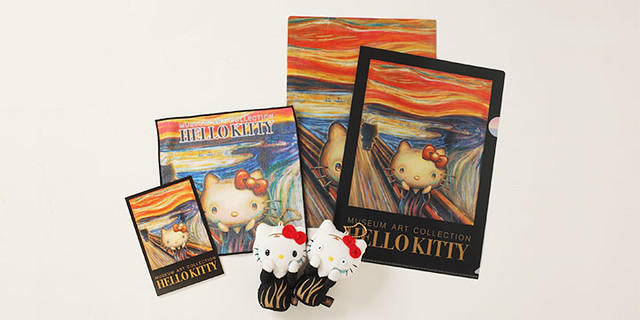 值得紀念的首款系列商品,是為了與挪威畫家愛德華‧孟克(Edvard Munch)經典名作「吶喊」(Skrik)聯名,紀念孟克誕生150週年,採用與「吶喊」相同的構圖與色彩,並且將背景的人也改為成凱蒂貓的模樣。預計將發行透明夾(368円)、迷你巾(578円)、吊飾娃娃(1260円)以及明信片。今後預計在美術館的商店也能夠購買的到。有興趣的凱蒂貓粉絲,可至以下網址購買:http://artartart.jp/?mode=f7