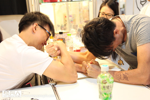 ▼ 晚上展場人潮較少的時候,香港的設計師們聚集在How2Work 的攤位玩了起來~ Molly 作者Kenny 的臂力驚人,左右開弓都行~ 連續獲勝記錄持續更新中...