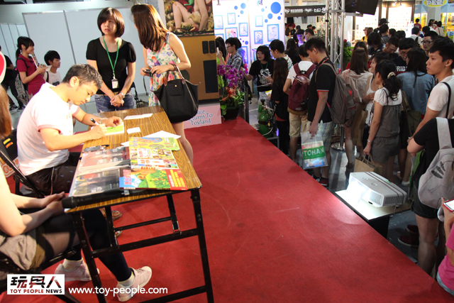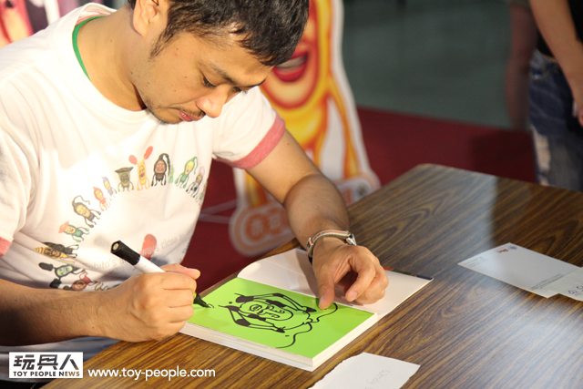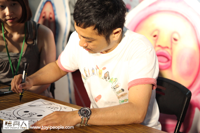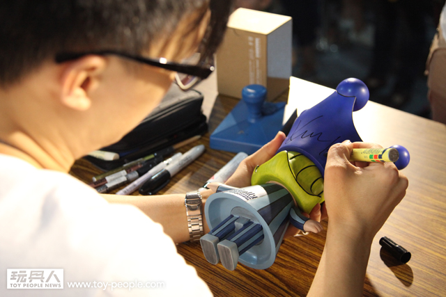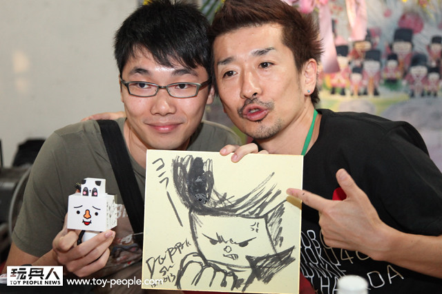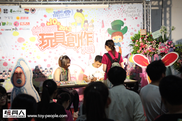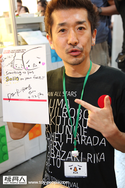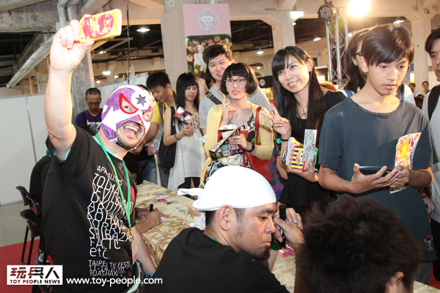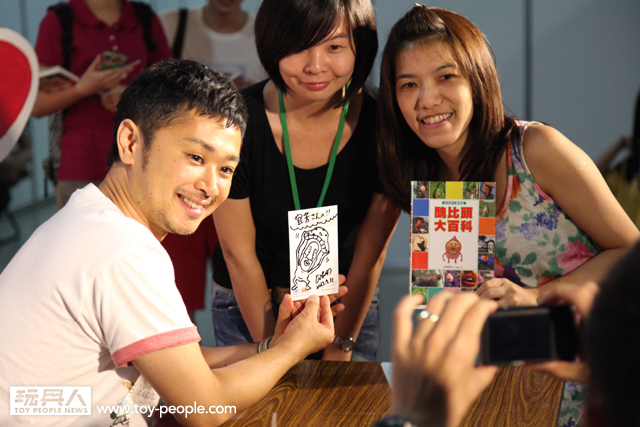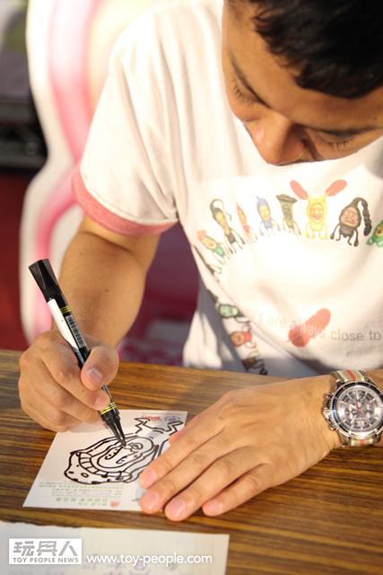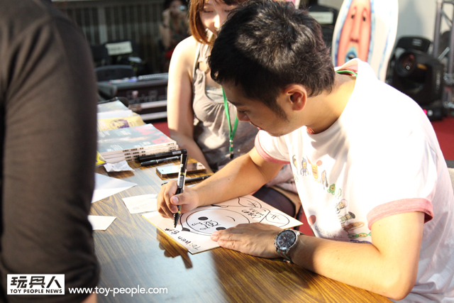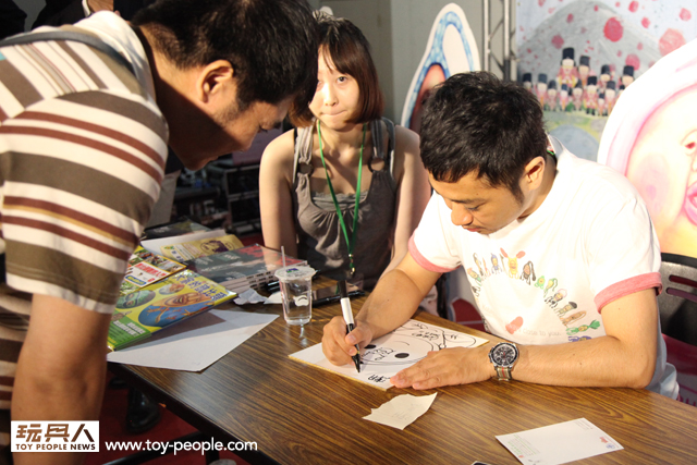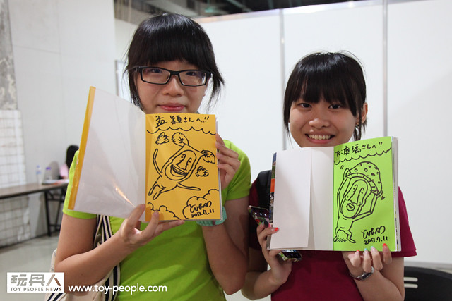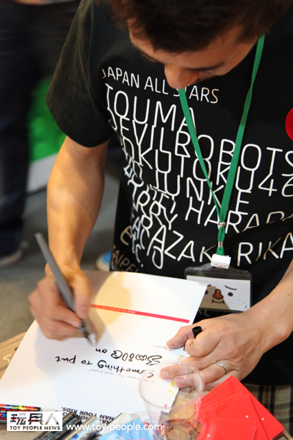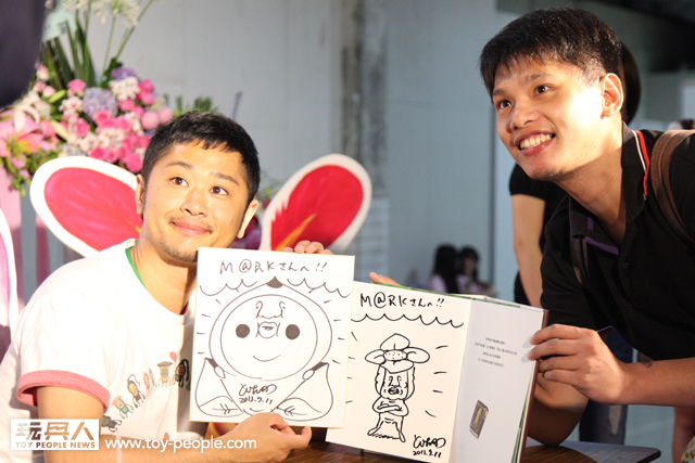 每年「台北國際玩具創作大展」(TTF2013)的重頭戲莫過於是設計師與玩具人們的見面簽名會,而今年開展當天就擺出了超豪華的陣容,打頭陣的就是醜比頭的設計師−名畑俊孝老師,簽名台下可是人山人海啊!每個玩具人都帶著滿滿的由老師所繪製的醜比頭角色走下台,看著側拍小編的心理真的是超級羨慕的。小編我也想要一張老師親筆繪製的ㄋㄟㄋㄟ頭啊~!