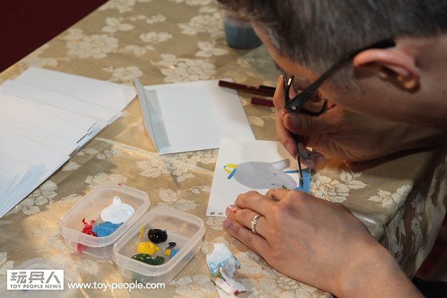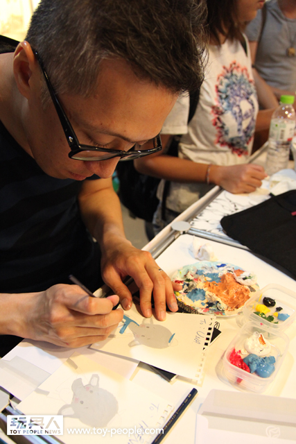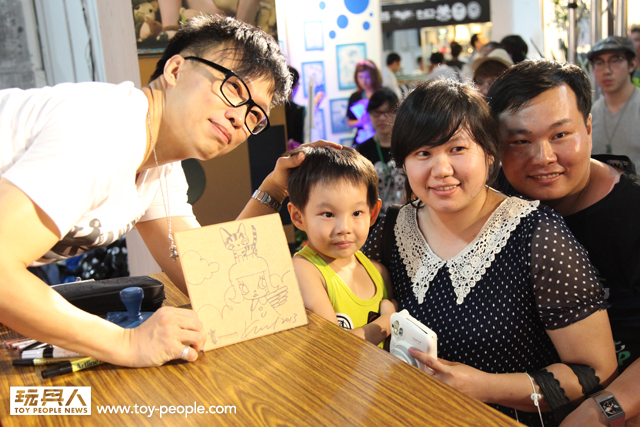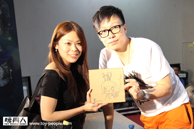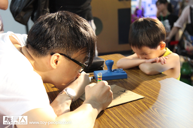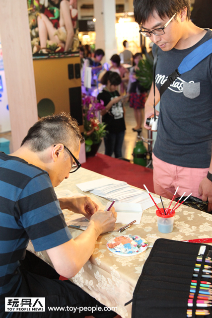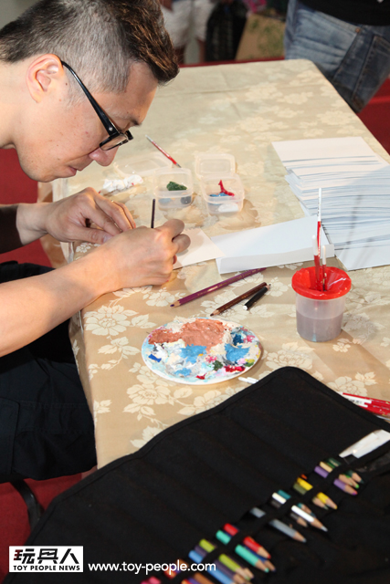 TTF 2013 第二天7月12日簽名會的重頭戲就是,今年主視覺的「龍家昇」老師簽名會,老師今年準備了許多神秘的信封,上台參加簽名會的玩具人可隨機抽選一張,老師會將信封中事先準備好的角色重新上色!甚至繪製新的服裝、背景、配件並署名,等於每位粉絲都能拿到一張龍家昇老師獨一無二的全彩親筆作品!能夠收到知名藝術家專門為自己的親筆創作,真的是千載難逢的機會啊!~ 簽名會時間截止之後,由於還有許多熱情的粉絲,龍老師還特地回到How2Work 的攤位,繼續幫每一位熱情的支持者一一將作品繪製完畢,龍老師的支持者們真是太幸福啦~(龍家昇老師的Facebook 粉絲專頁:龍家昇電影繪本art of movie)