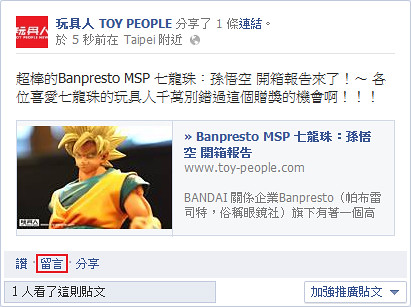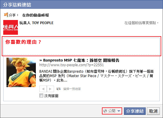 1.到『玩具人』本次的「Banpresto MSP 七龍珠:孫悟空 開箱報告」按“讚”,並分享至你的塗鴉牆上。(分享必需寫下你喜歡的理由於你的Facebook塗鴉牆上)