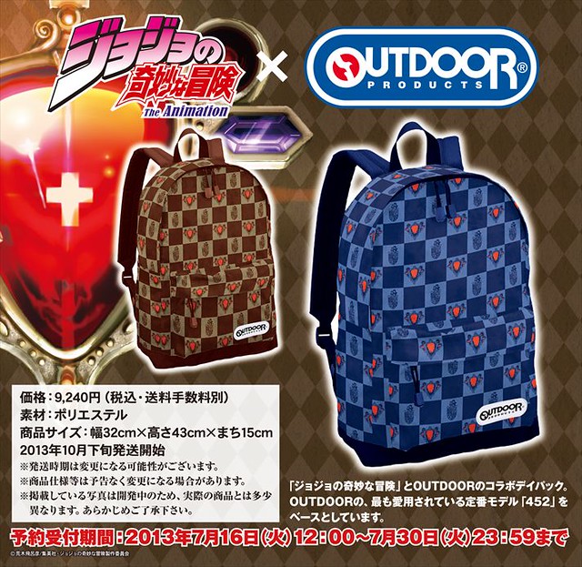 隨著「JOJO冒險野郎」第二部電視動畫版於日本播出,日本廠商也順勢推出了與OUTDOOR 聯名款式的「恩嘉紅寶石」背包,以及動畫版設定的「史比特‧瓦根財團」外套。