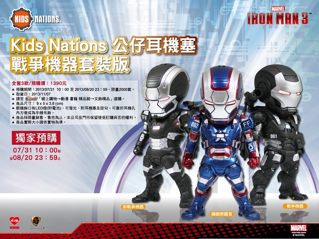由台灣野獸國玩具與Kids Logic聯名的「KIDS NATIONS」將再推出新款鐵人公仔耳機塞。根據KIDS NATIONS官方消息將會以香港動漫節特販商品形式推出。在7月30日前展場以3款一組的套裝方式販售,港幣售價350元。其中含了鋼鐵愛國者、戰爭機器以及戰爭機器2,絕對是鋼鐵人蒐藏家不能錯過的新作!