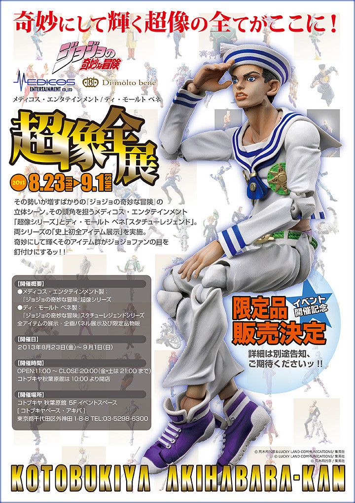在日medicos官網釋出最新展覽情報,預計於2013年8月23日~9月1日將舉辦其暢銷商品 超像可動、雕像傳說全系列展覽,當然展覽的同時也會推出限定品雕像傳說 スタチューレジェンド「プロシュート&ザ・グレイトフル・デッド セカンド」,普羅修特和其替身快速老化2次配色,將在展覽當天2013年8月23日開始販售,售價約10290元日幣,有興趣的玩具人可以參考下方延伸閱讀的部分,可以比較一次色的普羅修特和快速老化,更多詳細展覽情報也可以前往下方出處參考。