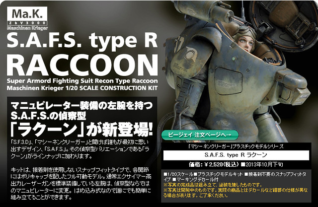 由日本知名模型廠商“WAVE”所發行的暢銷科幻系列作品“Maschinen Krieger”(簡稱Ma.K / マシーネンクリーガー)1/20 比例模型,推出最新版本、代號「浣熊」(Raccoon)的偵察型「S.A.F.S」,全名為“Super Armord Fighting Suit Recon Type Raccoon”。最大的特色在於是純偵察型的S.A.F.S,所以左手沒有配備武裝,而同樣是機械手腕。