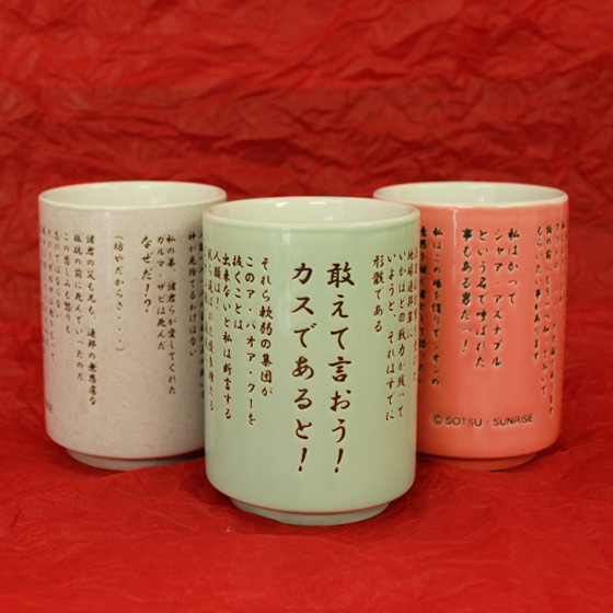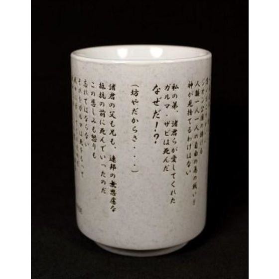 「有沒有誤報!?」當然沒有啦!現在為您介紹的是日本 GUNDAM Cafe online的開發企畫,把RX-78-2、MS-06-S以及量產紮古製作成馬克杯,絕對會是鋼彈迷家裡必備雜貨!每款日幣售價1200圓並附贈咖啡券一張。您也可以賣套裝內含RX-78-21杯、MS-06-S1杯以及量產紮古2杯,日幣售價4800並附贈咖啡券四張。前兩百名購買者還附贈GUNDAM Cafe 餐點造型吊飾兩個!附帶一題還有推出「名演說版」,把原作中振奮人心的演講都抄錄上去,絕對提神絕對勵志!各位鋼彈迷一起來一杯吧!