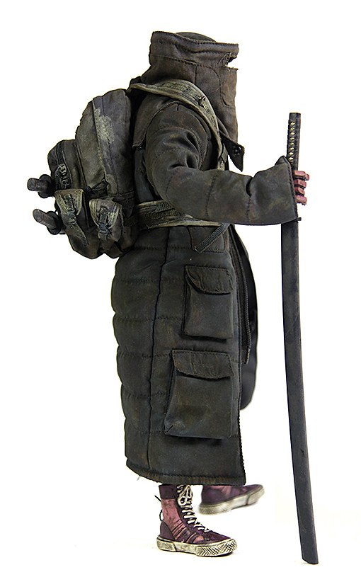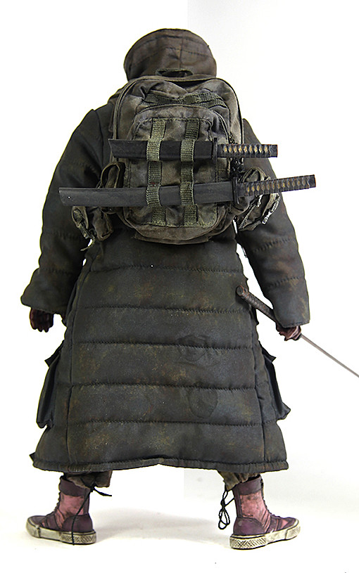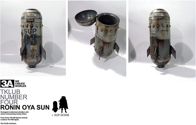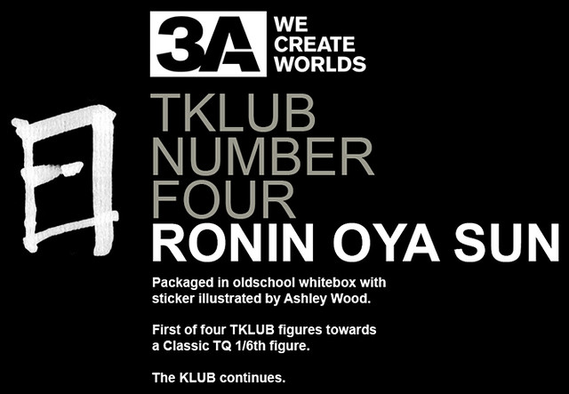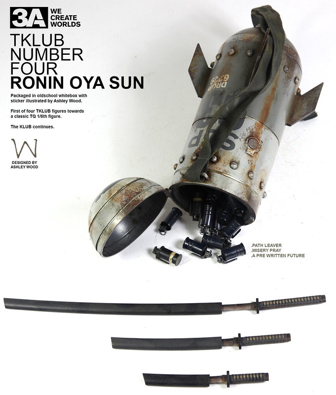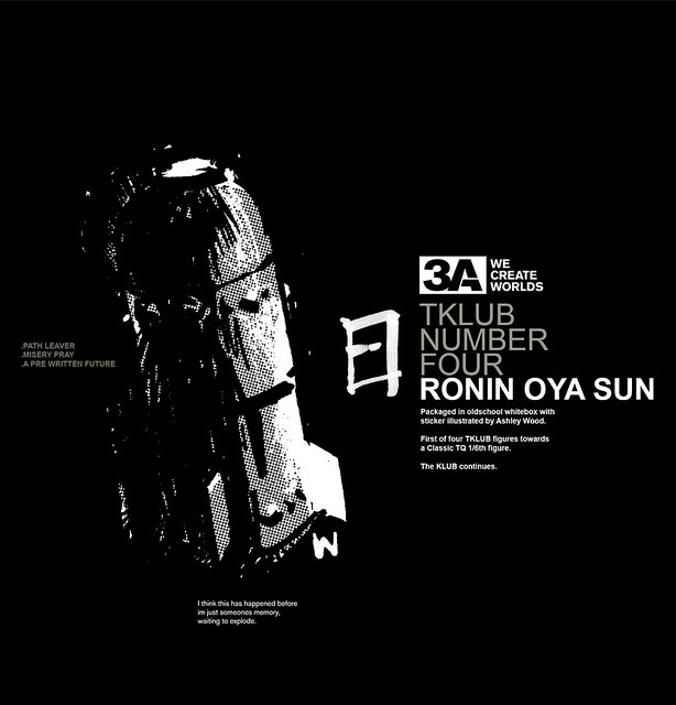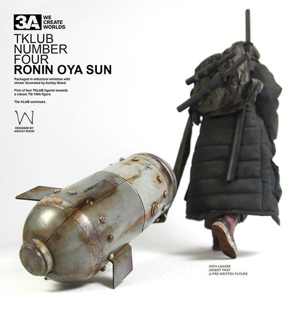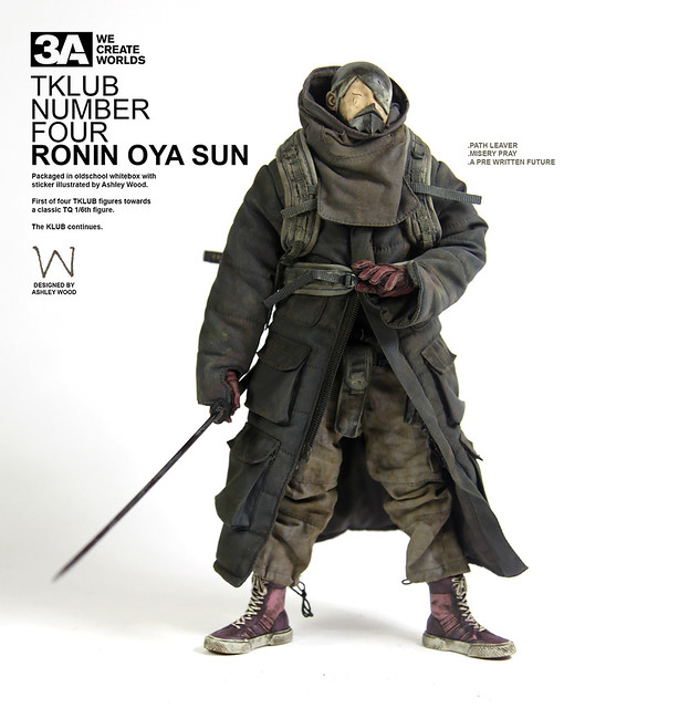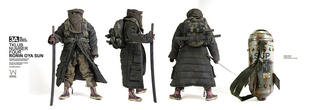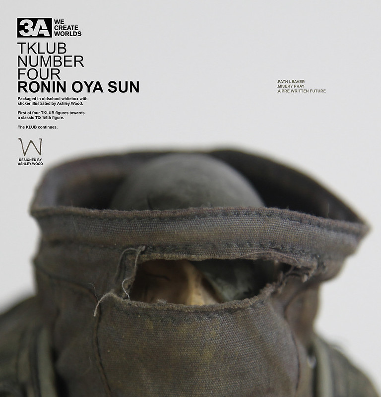 threeA 今天公開了一張TK俱樂部第四彈最新作品“RONIN OYA SUN” 預告圖!~ 過去Ashley Wood 已預告過不再發行其它款式的“OYA TK”(OYABUN / 身穿羽絨大衣的款式),但這次掛上了“浪人”(RONIN)字樣,穿著的是長大衣,並配備一款可收納武裝的飛彈,以及彷彿日本“虚無僧”所戴、被稱為「天蓋」的深編笠造型面罩。
