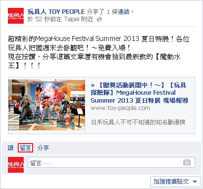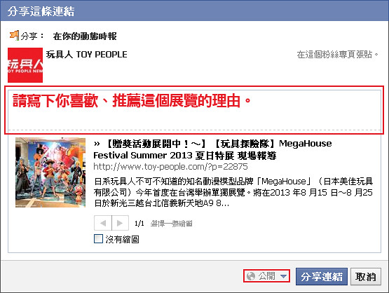 1.到『玩具人』本次的『MegaHouse Festival Summer 2013 夏日特展 現場報導』按“讚”,並分享至你的塗鴉牆上。(分享必需寫你你喜歡、推薦這個展覽的理由,於你的Facebook塗鴉牆上)