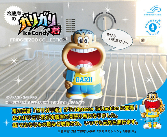 專門製作冰箱提醒商品的fridgeezoo預計在今年2013年夏天推出與ガリガリ君 冰棒君(暫時翻譯)合作款,取名為 冷蔵庫のガリガリ君 (冰箱的ガリガリ君) 冰箱門沒關提醒器,因為有時候打開冰箱後會忘記把冰箱門關上,這個fridgeezoo提醒器就會發出聲音告訴你 請把冰箱門關上,真是個環保小尖兵讓你不會忘記把冰箱門關上浪費電,冰箱的ガリガリ君 尺寸高約8.9公分,需要使用3個小型水銀電池,售價約2300元日幣,有興趣的玩具人可以參考一下下方影片 冰箱的ガリガリ君 在你冰箱門沒關的情況下會發出的對白聲音。