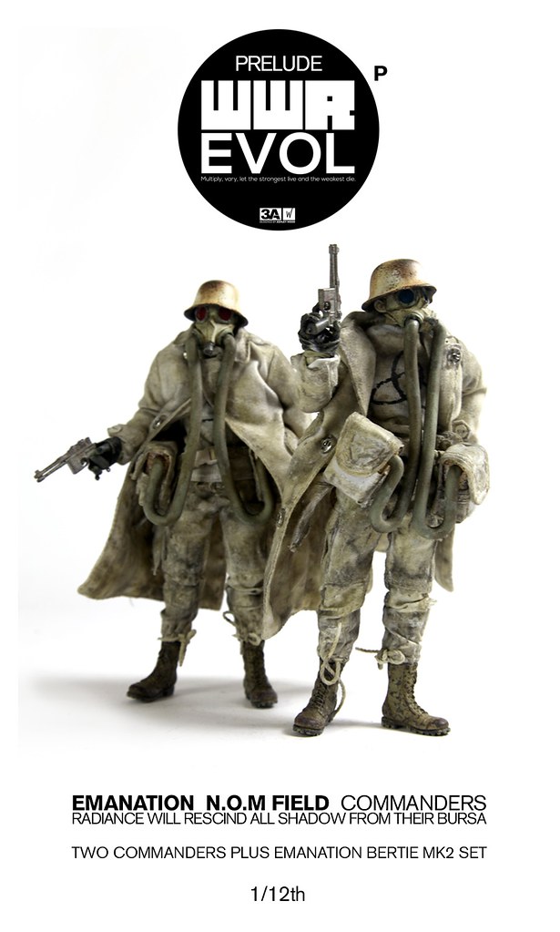 threeA 今日無預警地突然上架了新產品,1/12 比例系列WWRp「EVOL NOM Commanders」。這是經典的機器人大戰作品「WWR」的縮小作品系列「WWRP」(World War Robot Portable),類似過去所發行的經典NOM 指揮官人偶組合,但並不是實際的“Thrice Naut” 與 “Post Fire”版,以1/12 比例推出所以面罩不可脫。