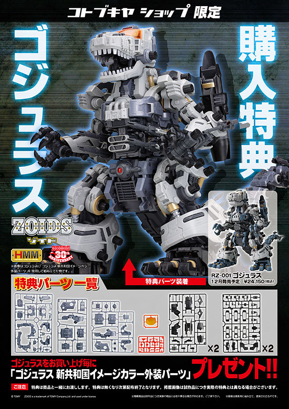 由壽屋與TakaraTomy 聯名合作,將TakaraTomy 1980 年代經典玩具ZOIDS(ゾイド)再度重現的系列“HMM”(Highend Master Model),將在ZOIDS 值得紀念的發售30週年紀念,發售全系列最龐大款式「RZ-001 哥吉拉斯」(GOJULAS / ゴジュラス)!
