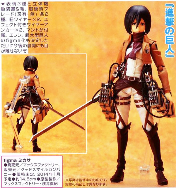 日Good smile company玩具公司的figma可動系列預計2014年1月推出進擊的巨人 三笠,在今夏的Wonder Festival 2013(夏)展覽中已先行曝光樣品,這次在最新期的figure王雜誌在公開販售日期,尺寸高約14.5公分,售價尚未公佈,玩具人網站會持續關注後續販售相關資訊。