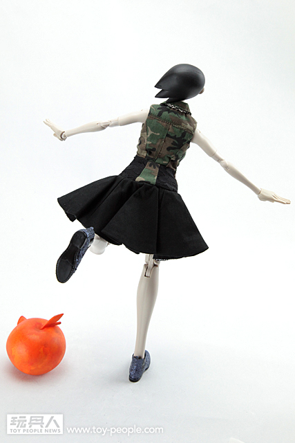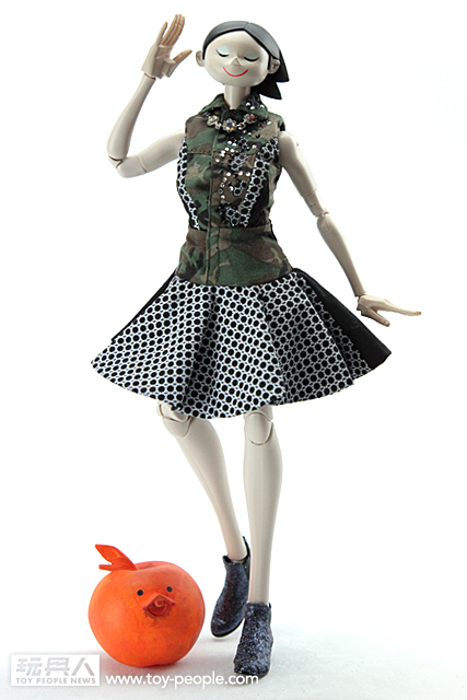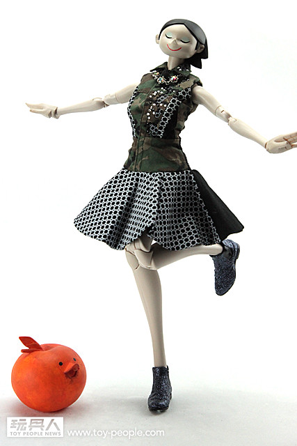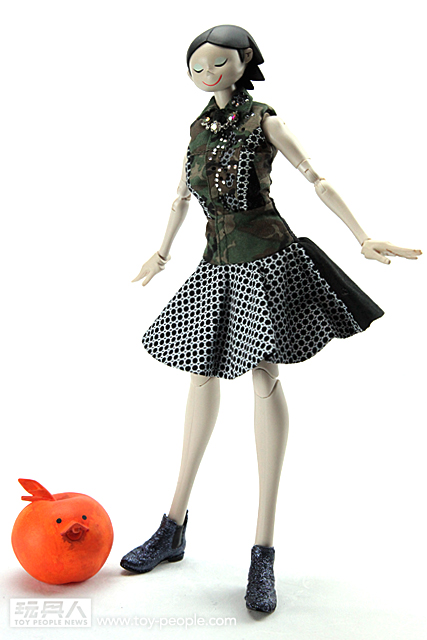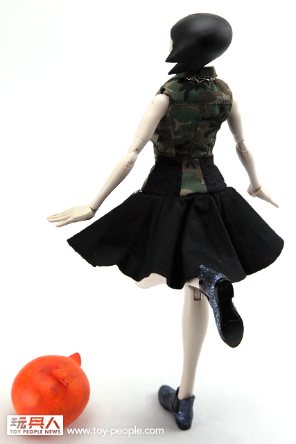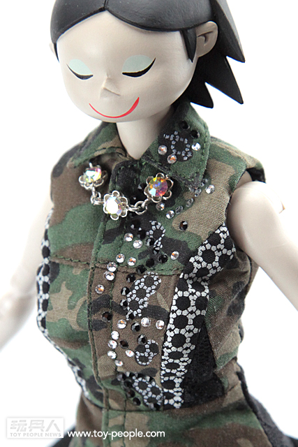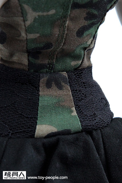 ▼ Giselle 這次所穿的叢林迷彩色洋裝,是來自知名義大利設計師Antonio Marras 以自己的名字創立的品牌。這款由Antonio Marras 所設計的洋裝是無袖、有領子且由卡其迷彩與黑色布料拼接而成的作品,洋裝上的黑寶石與透明寶石的裝飾讓整體的感覺更有張力。最厲害的是threeA 這次竟然能將真人比例的服飾作品完整的移植到1/6 比例的人偶作品上,不管是在剪裁、裙子上的印花、洋裝材質的部分都完整的呈現出來。