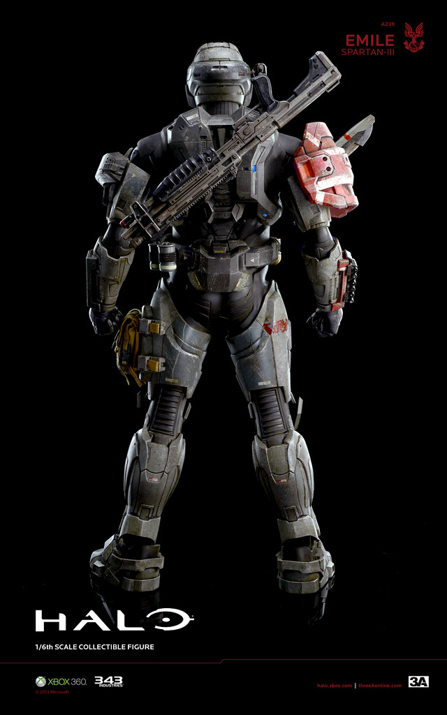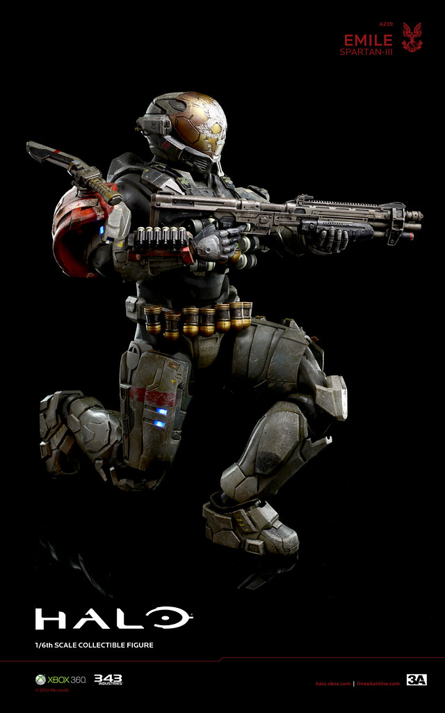 由於原作中的設定Emile 身高約6 呎10 吋(約208公分),所以忠實呈現其1/6 比例高度約13.5英吋,並採用了與“SPARTAN MKV Commando”相同的光纖戰鬥服設計,可忠實呈現身上各處的發光效果,以及使用特殊技術製作的全身包膠設計,不論各種角度都不會露出關節破壞外觀,包括了手掌的每根手指具可動效果!此外,搭配武裝的M45 戰術散彈槍(M45 Tactical Shotgun)、大型廓爾克刀(Kukri Knife)以及手榴彈帶也高度細節地重現。