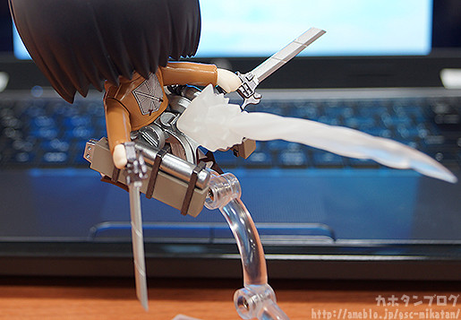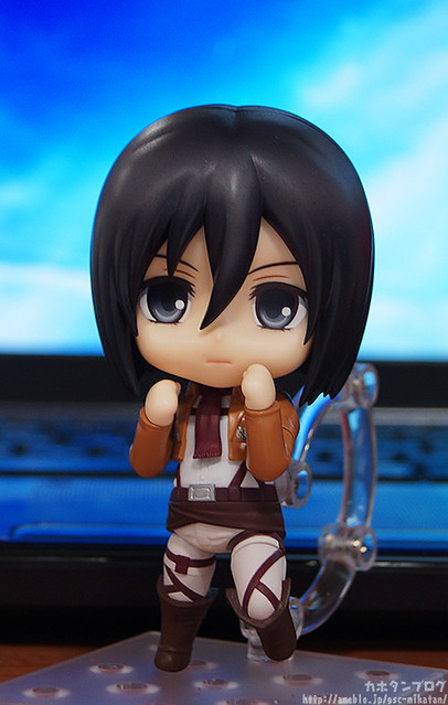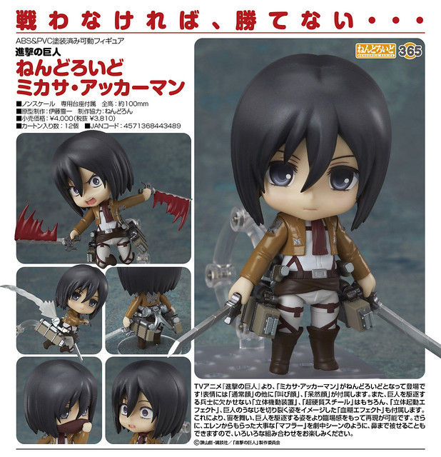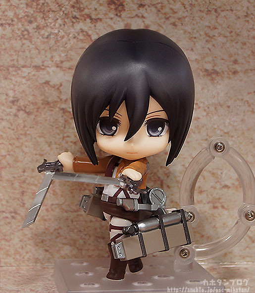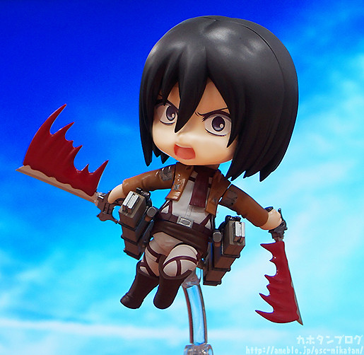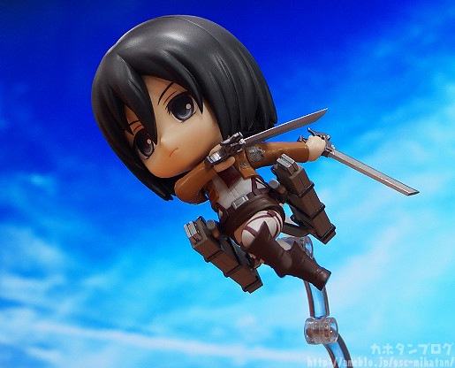 2013年8月30日新增官網大張宣傳照片,Good Smile Company 黏土人 進擊的巨人 三笠預計2014年1月發行,售價約4000元日幣,尺寸高約10公分,附有「通常顔」、「叫び顔」、「呆然顔」約三種顏部表情可以替換,喜歡進擊的巨人的玩具人可以參考一下歐。