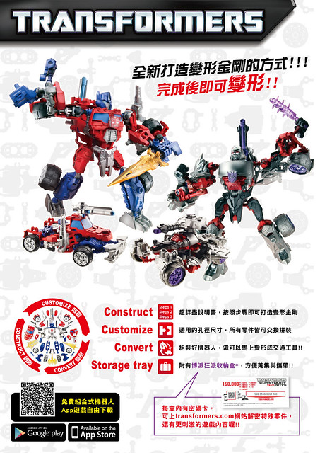 孩之寶也很詳細地將新產品的四大特點寫在介紹手冊中,接下來我們會一一跟各位詳細介紹。另外裡面還提到有免費的App遊戲軟體可以下載來玩….這…是要人無時無刻都要玩變形金剛的意思嗎?!根據孩之寶表示,App在9/01起會有中文版遊戲軟體在App store與Google Play上架可供玩家免費下載(下載連結http://www.hasbro.com/transformers/en_US/construct-bots/),現在App store已有英文版(https://itunes.apple.com/us/app/transformers-construct-bots/id661826426?ls=1) 想嘗鮮的人可以來去試試看喔~