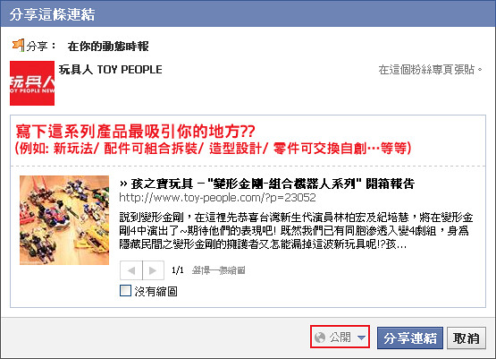 1.到本次的「孩之寶玩具 - "變形金剛-組合機器人系列" 開箱報告告」商品開箱報告文章按“讚”,並分享至你的塗鴉牆上,這系列產品最吸引你的地方??。只寫“已分享”是不會中獎的喔!