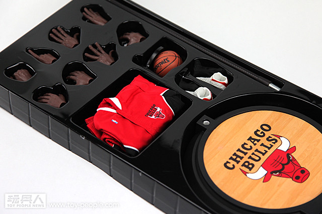 ▼ 左側是精彩的配件:替換手部零件、1/6 比例斯伯丁籃球、零售版限定公牛隊熱身服、一雙Air Jordan 13代以及印有芝加哥公牛隊圖樣的地台與支架。