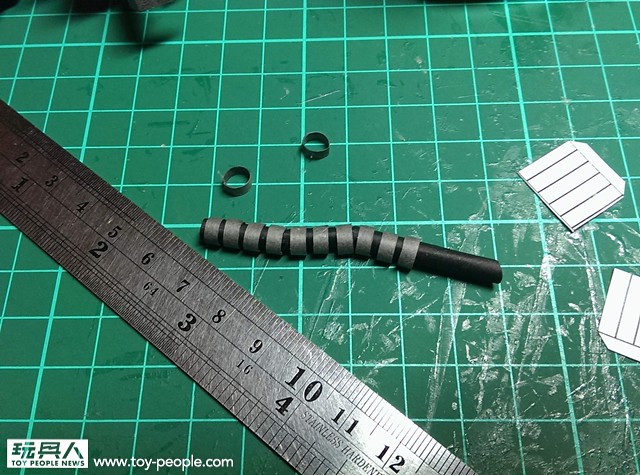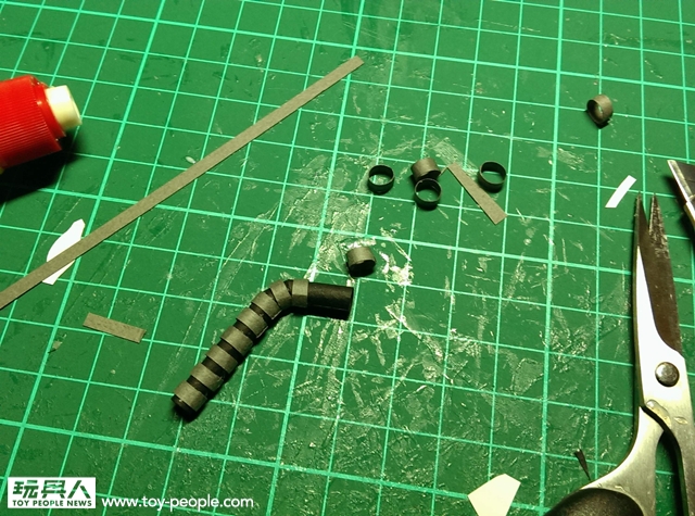 ▼ 1.先將輸送管的骨架完成,然後再用同寬度的小紙條"捲"成圓形。(這非常磨練耐性...)