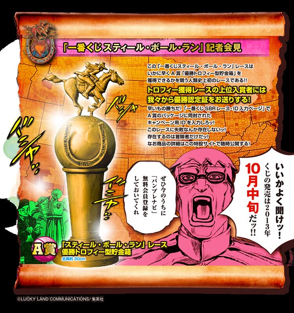 隨著BANDAI NAMCO 近期發售、引發JOJO 冒險野郎熱潮的PS3 對戰格鬥遊戲「JOJO冒險野郎群星大亂鬥」,日本景品廠商Banpresto 所推出的「一番賞」(一番くじ)順勢推出了最新作「一番くじ ジョジョの奇妙な冒険 Part7 SBR」。