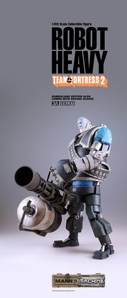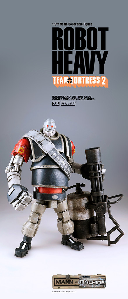 香港知名的玩具廠商threeA 宣布將發行 絕地要塞2 「曼恩對決機器」機器重裝兵!這是出自知名的電玩公司“Valve”所推出的對人團隊電玩遊戲“絕地要塞2”(Team Fortress 2),於2012年更新的合作模式“曼恩對決機器”(Mann vs. Machine)。