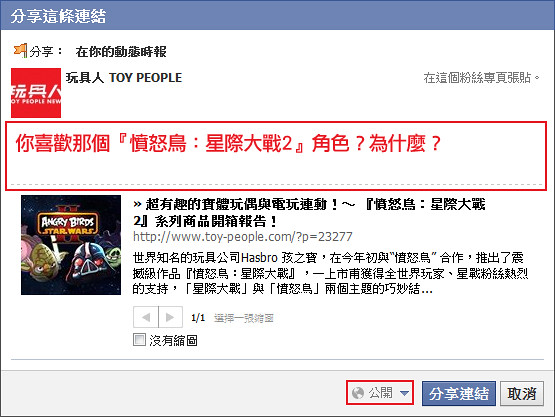 1.到本次的「『憤怒鳥:星際大戰2』系列商品開箱報告!」開箱報告文章按“讚”,並分享至你的塗鴉牆上,寫下你最喜歡的『憤怒鳥:星際大戰』登場角色與理由? 記住,只寫“已分享”是鐵定不會中獎的喔!
