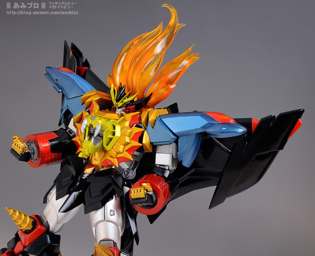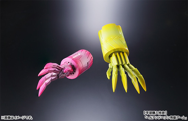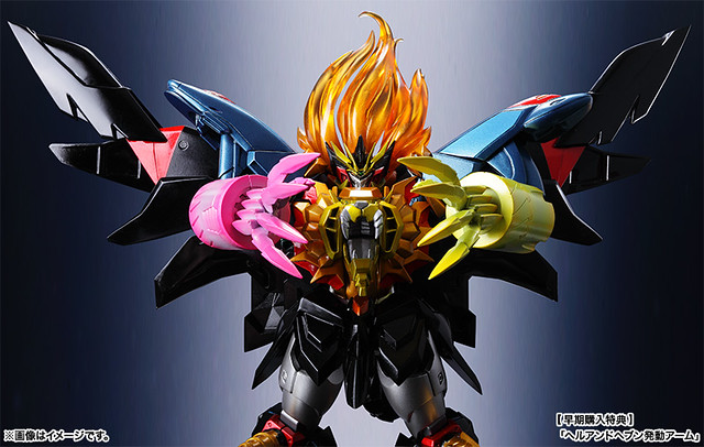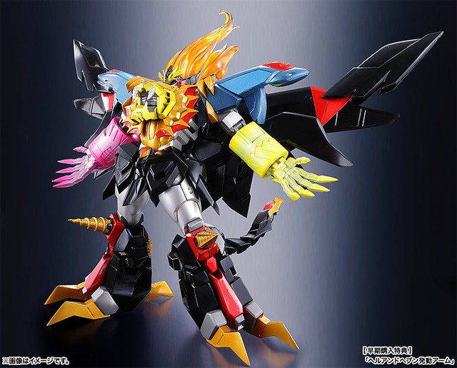 2013年10月30日新增官網宣傳照片,背後飛行翼展開時的全幅寬尺寸約26公分,本體尺寸高度約為16公分,附有可以替換手首、武器鑽頭和支撐支架等等配件,早期購入特典「ヘルアンドヘブン発動アーム」首批並附送特典,喜歡勇者王系列的玩具人千萬別錯過了!