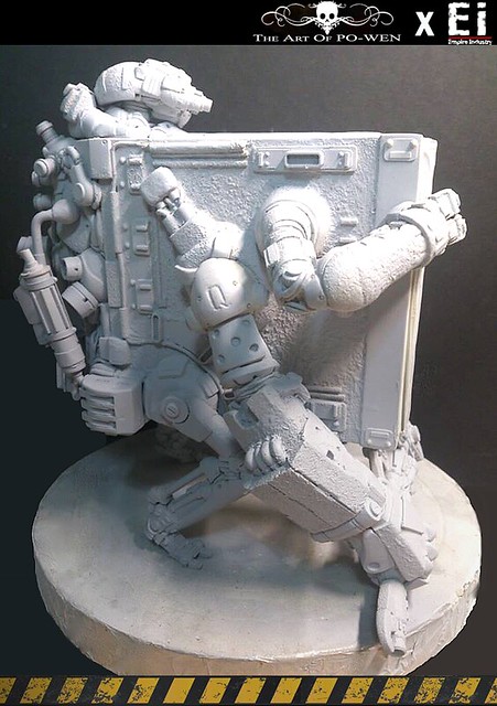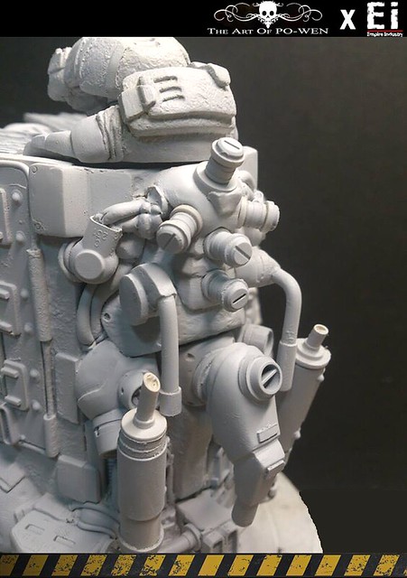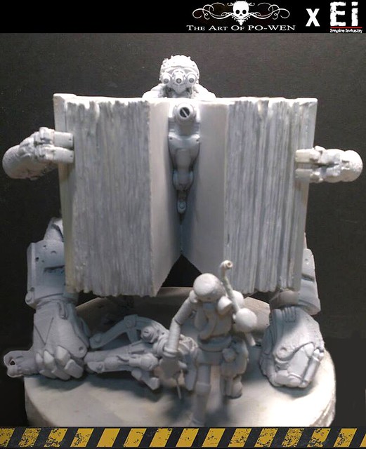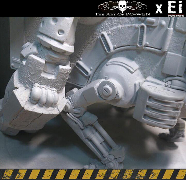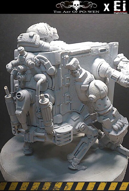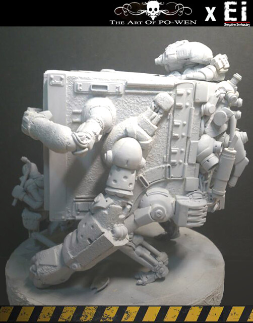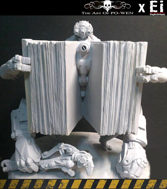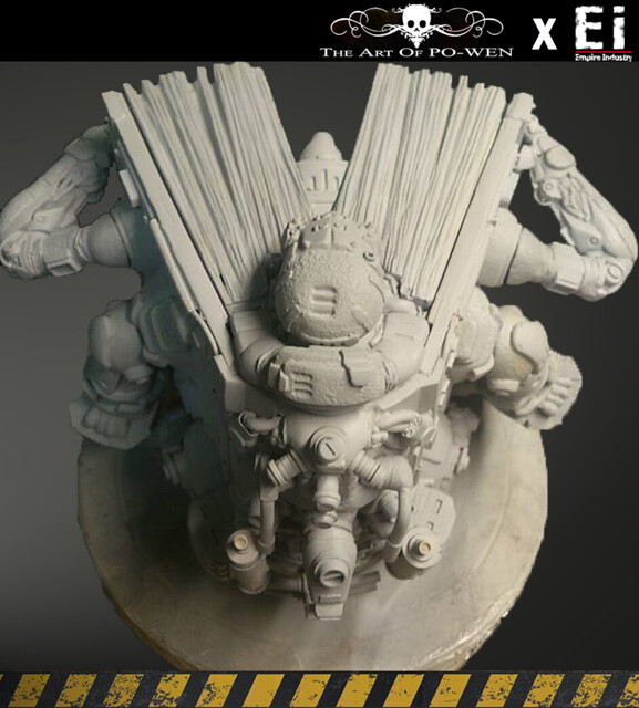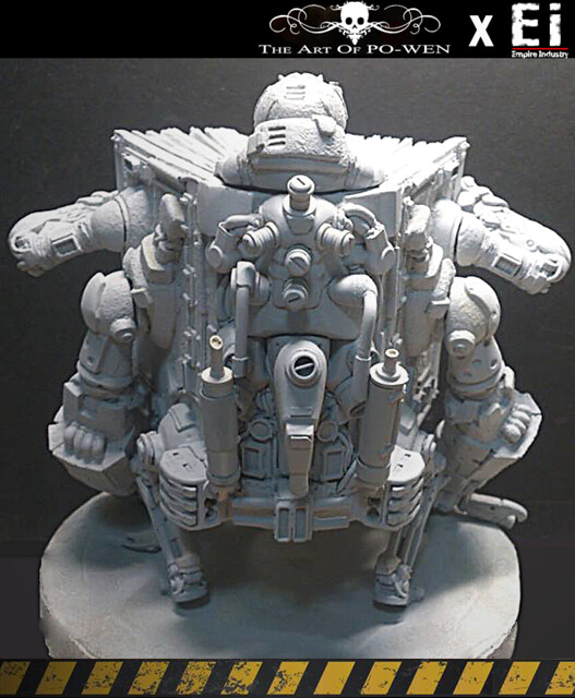 平面作品透過PO WEN的構思繪製,以灰暗的環境色調以及刻意弱化的機鎧光澤成功的詮釋與營造戰爭的進行式,但仍以豐富且純熟細膩的色彩搭配與筆觸運用,揭示PO WEN創作的特色。透過『帝國工業:重污染』的巧手與巧思,十分難以想像的,由生活中機械零件所配置組合而成整個原型!