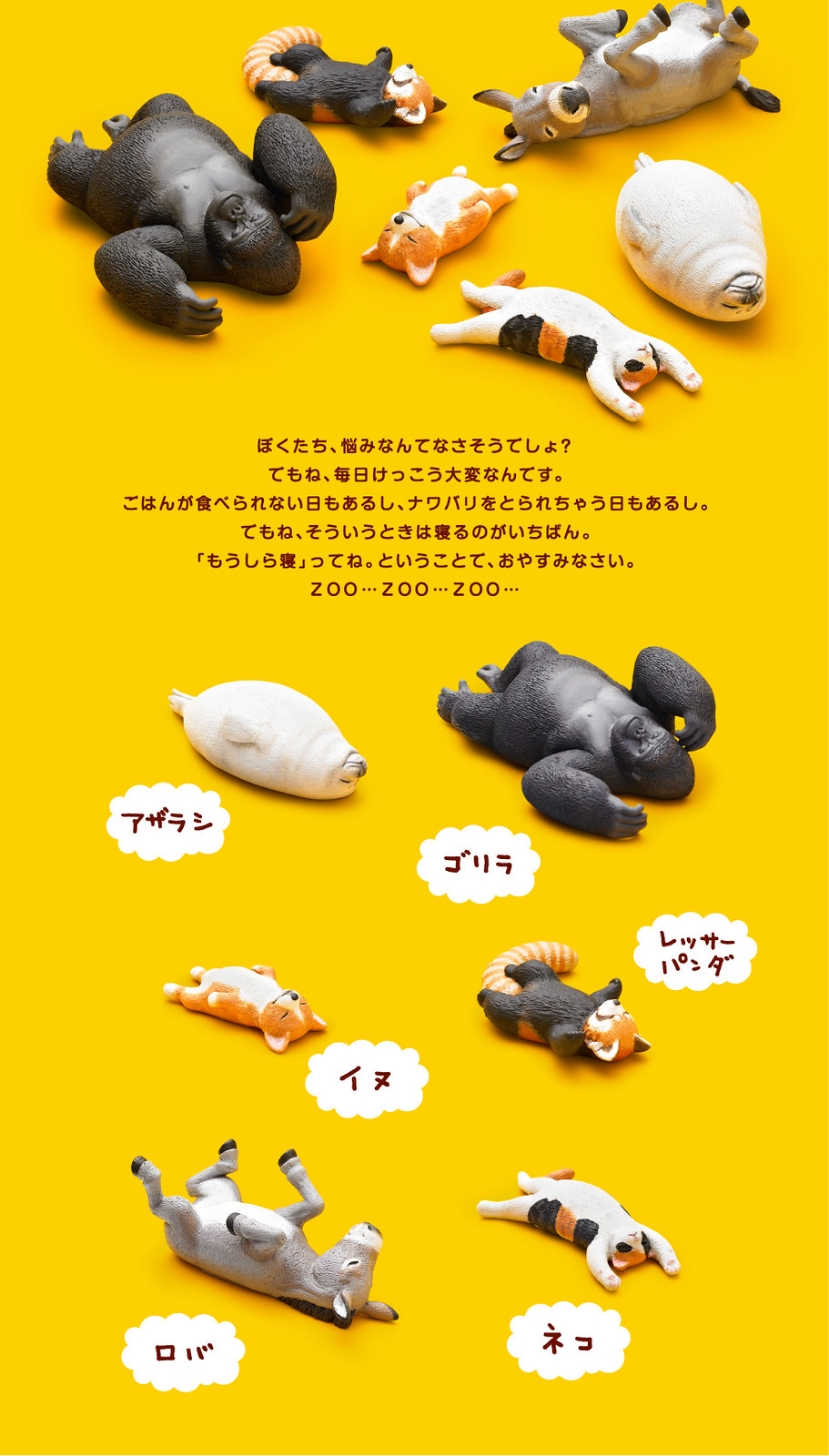 日TAKARA TOMY 玩具公司的可愛系列パンダの穴(熊貓之穴)轉蛋商品,繼第一彈的超詭異吊飾『炸鯊魚』、以及先前WF 2013 引發大熱潮的『不沈思者』之後,將推出少了點詭異、多了點療癒的新作「ZooZooZoo」(睡覺的動物園,暫時翻譯),將動物園裡面的猩猩、驢子、貓咪、小海豹和小貓熊等等六款可愛的動物以他們睡覺的模樣呈現,每款動物睡著的樣子多相當有趣味,看了十足的撫慰人心啊~ 喜歡動物的玩具人千萬別錯過了喔!