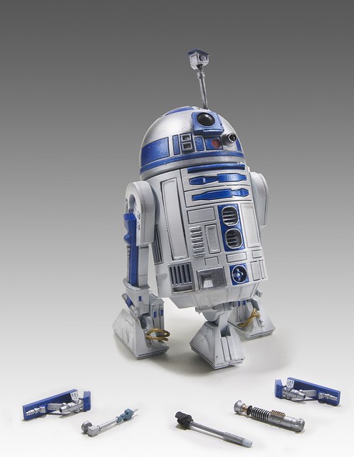 ▼ 第二款是貫穿整個星戰歷史,幾乎所有經典場面都出現的R2-D2;雖然造型簡單,卻搭配了豐富的配件,可以重現這個維修機器人維修、偵察...等機構,並附有一把路克天行者在故事後期所使用的綠色光劍劍柄。