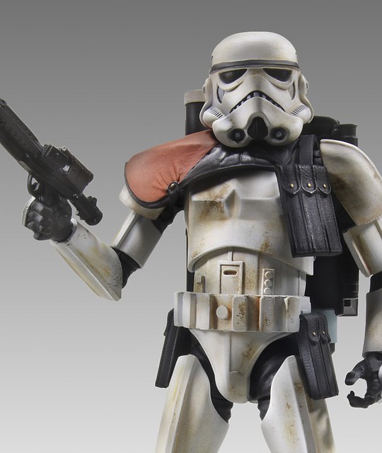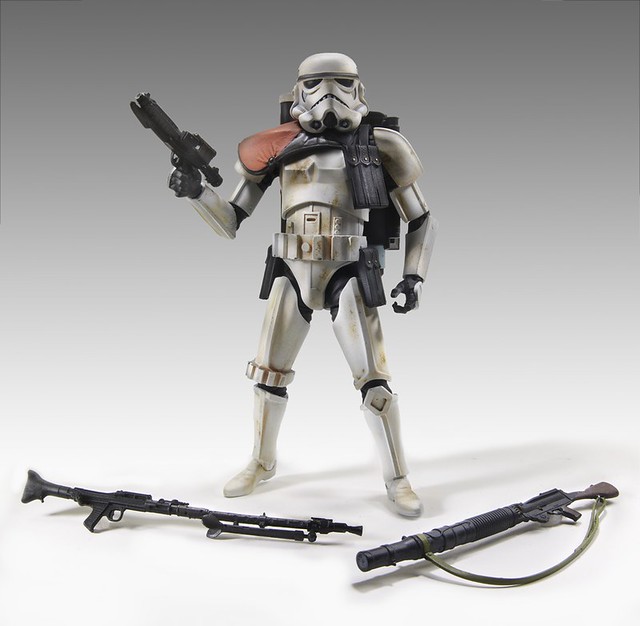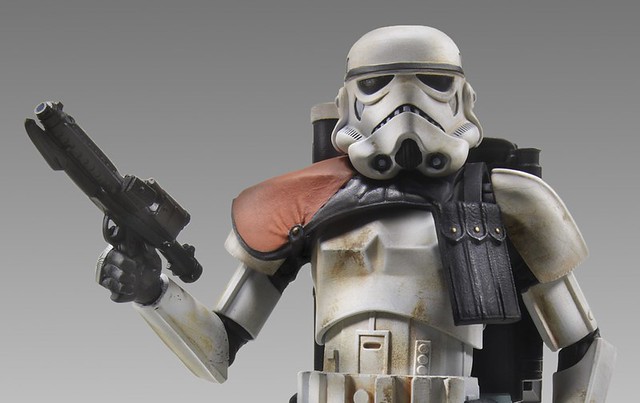 ▼ 最後一款是星際大戰中許多玩具人喜愛的“沙漠暴風兵”(SANDTROOPER)。除了用心的沙漠舊化塗裝之外,背包的造型相當地講究,並豪華地配備了三款“沙漠暴風兵”的武器:BlasTech DLT-19 Heavy Blaster Rifle、BlasTech T-21 Light Repeating Blaster Rifle 以及基本武裝E-11 blaster rifle。