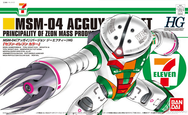 日BANDAI萬代玩具公司已在2013年9月底推出了 7-11(便利商店)限定販售的模型 HGUC 1/144 Acguy Ver,GET(7-11 Original Color),以7-11 便利商店的配色的亞凱(暫時翻譯)機體,很受歡迎的亞凱(Acguy)讓喜歡玩改造塗裝的模型玩家,可以隨意改變亞凱的外部塗裝就非常有創意,組裝尺寸比例為1/144,已經在日本全國的7-11便利商店開始販售,售價約1,785元日幣,有興趣又喜歡自行組裝模型的玩具人,可以請有前往日本旅行的朋友幫你購買這個伴手禮歐。